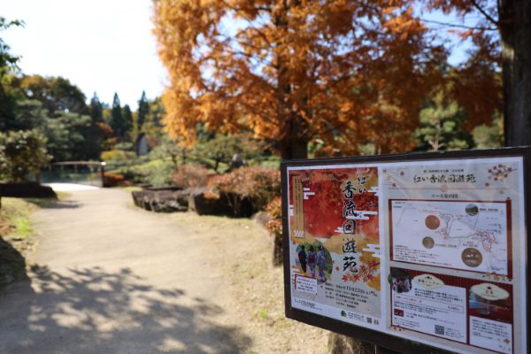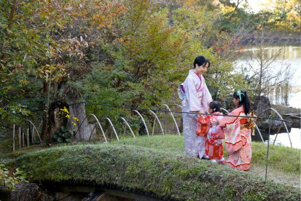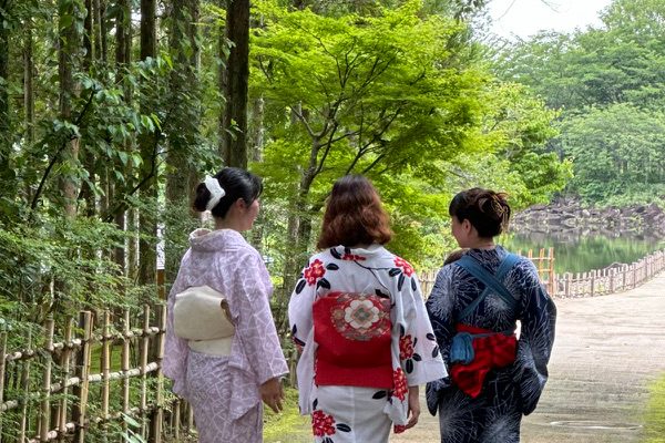 秋晴れの中、日本庭園を和服で散歩することができる着付け体験イベントが開催されました。 |